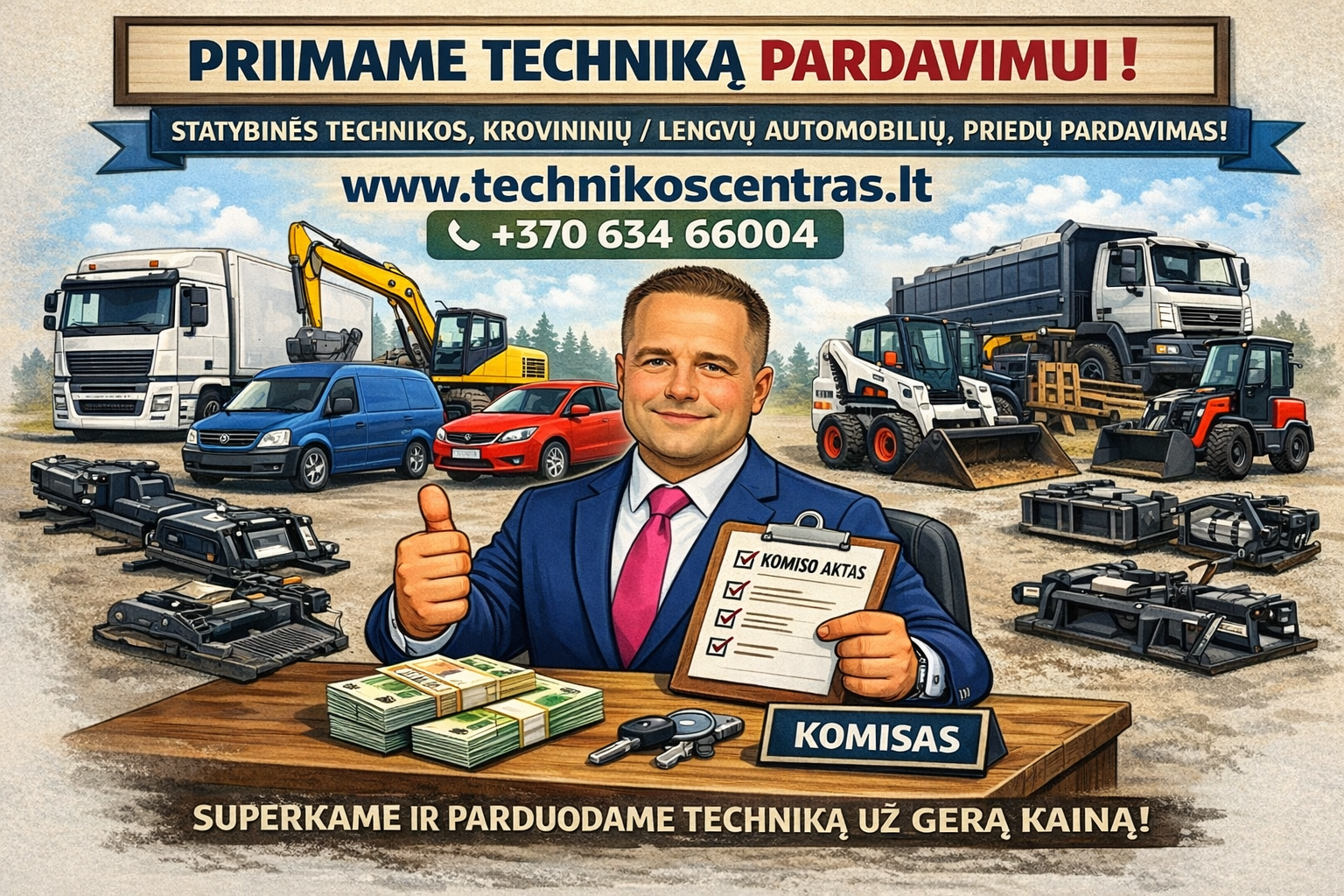 Parduokite savo statybinę, žemės ūkio ar sandėliavimo techniką efektyviau. Mes pasirūpiname visu procesu: nuo profesionalaus vertinimo iki galutinio sandorio. Jūsų technika stovės matomiausioje Lietuvos vietoje.
